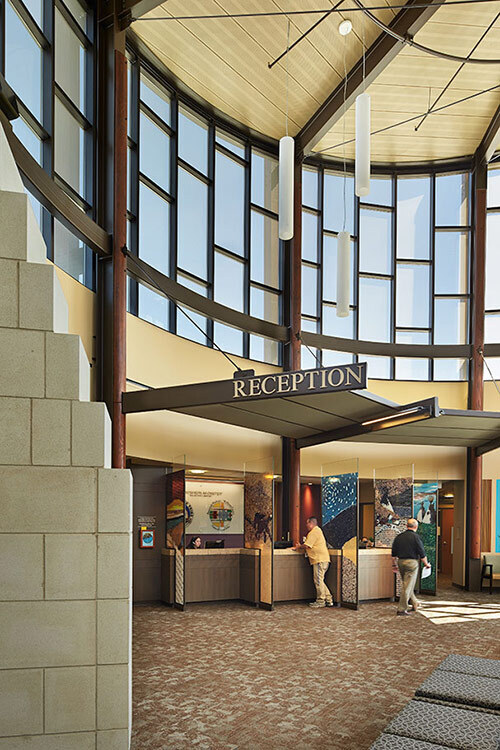 Designed by NAC Architecture to achieve LEED Silver, the building celebrates the Tribe’s relationship to the land, appearing to rise from the earth as a natural formation using natural materials from the local environment. A roof garden not only provides comfortable outdoor space for the staff and community, but also an expansion space for future growth. The Rotunda in the center of the building represents a gathering place for the community to come together to celebrate the culture and traditions of the Tribe.
