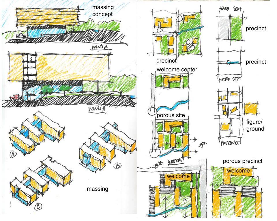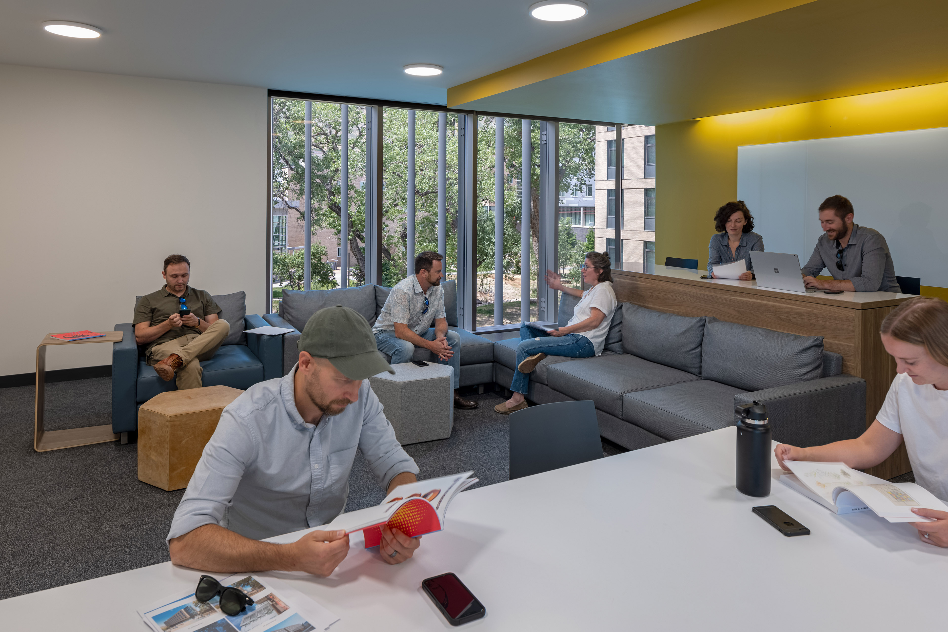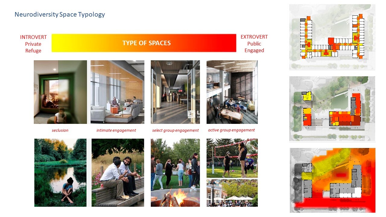 A main objective in designing the hall was to engage students through a variety of spaces designed for students sensitive to stimuli. The project features study area, social lounges, and public restrooms for communities of 35 students. The interior space is pulled together with a water feature that meanders through the space. Both tranquil and active common areas are included, allowing students a choice and the ability to be alone or socialize in a more open setting. The first floor includes a hub that connects Spruce Hall to a new student housing “neighborhood” with a wide variety of indoor and outdoor spaces to study and eat. Outside of the first floor is an intimate Zen garden, outdoor fire pit and barbecue, amphitheater, a stretch of sidewalk with seating along the pedestrian mall, access to the waterway, and an active green. There is also a fitness center, a collaboration workspace, bike/ski storage, a bike repair center, a large community lounge, a gender-neutral restroom, a game room, and Zima Café, offering innovative organic food and seating with panoramic mountain views.
